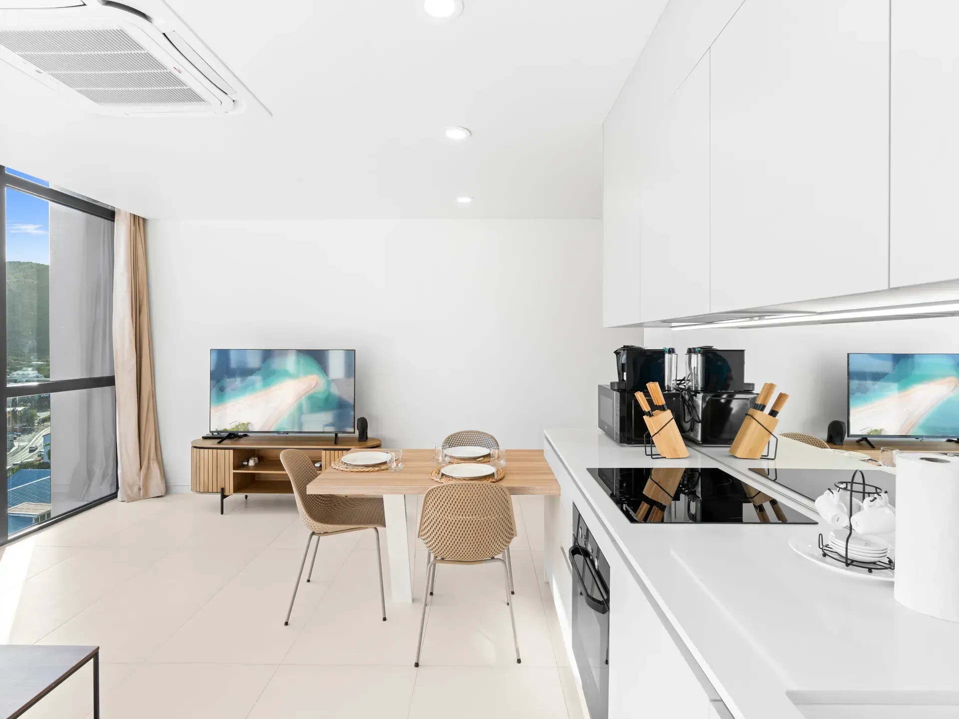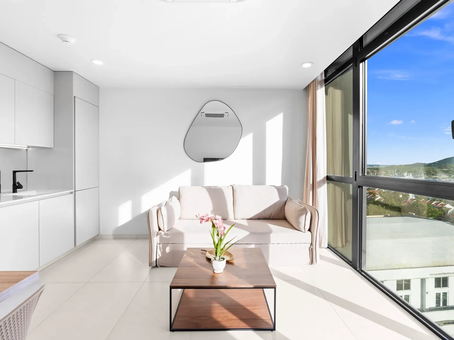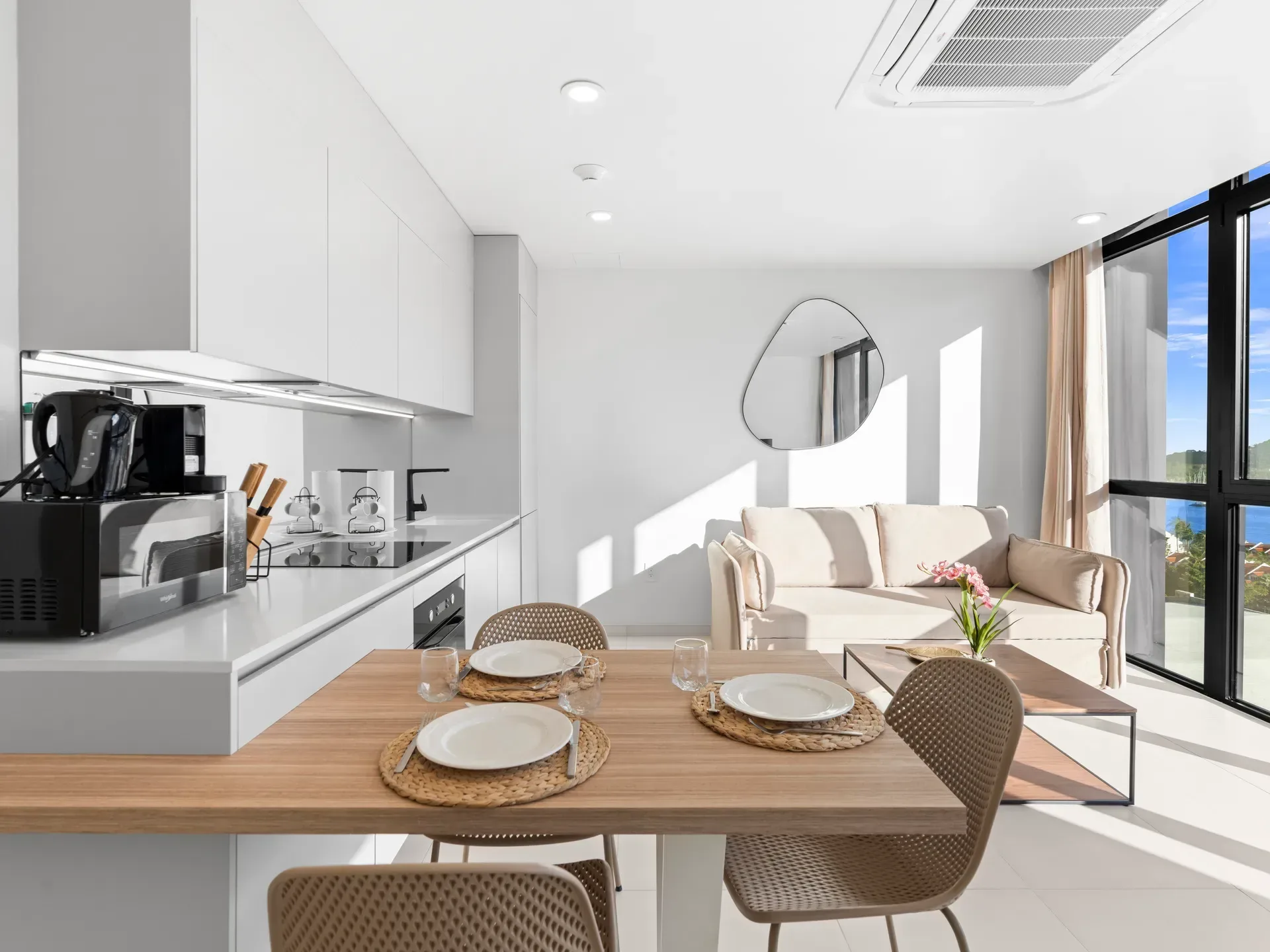 Balcon privé offrant une vue paisible sur le lagon et baignant l’appartement de lumière naturelle