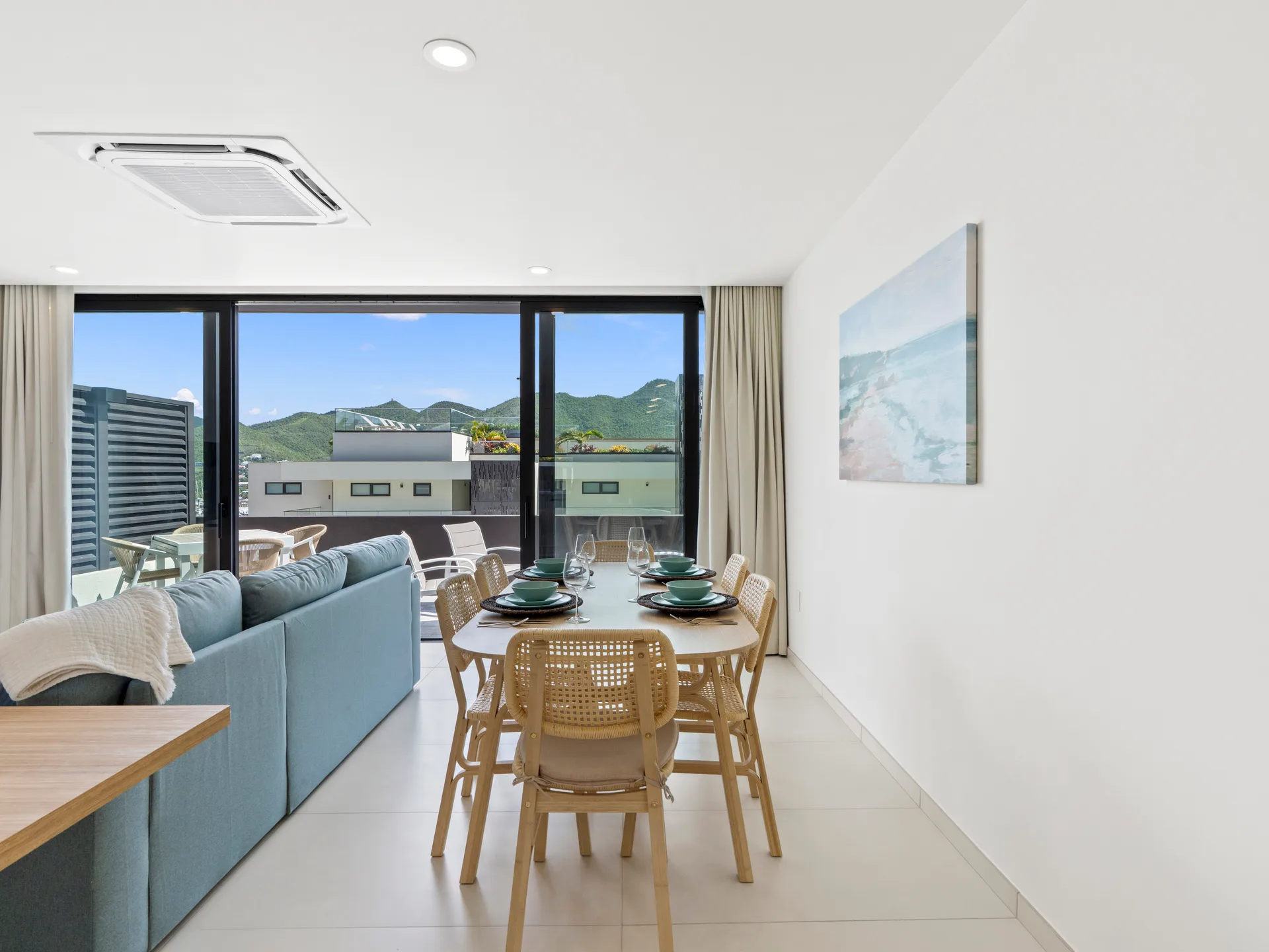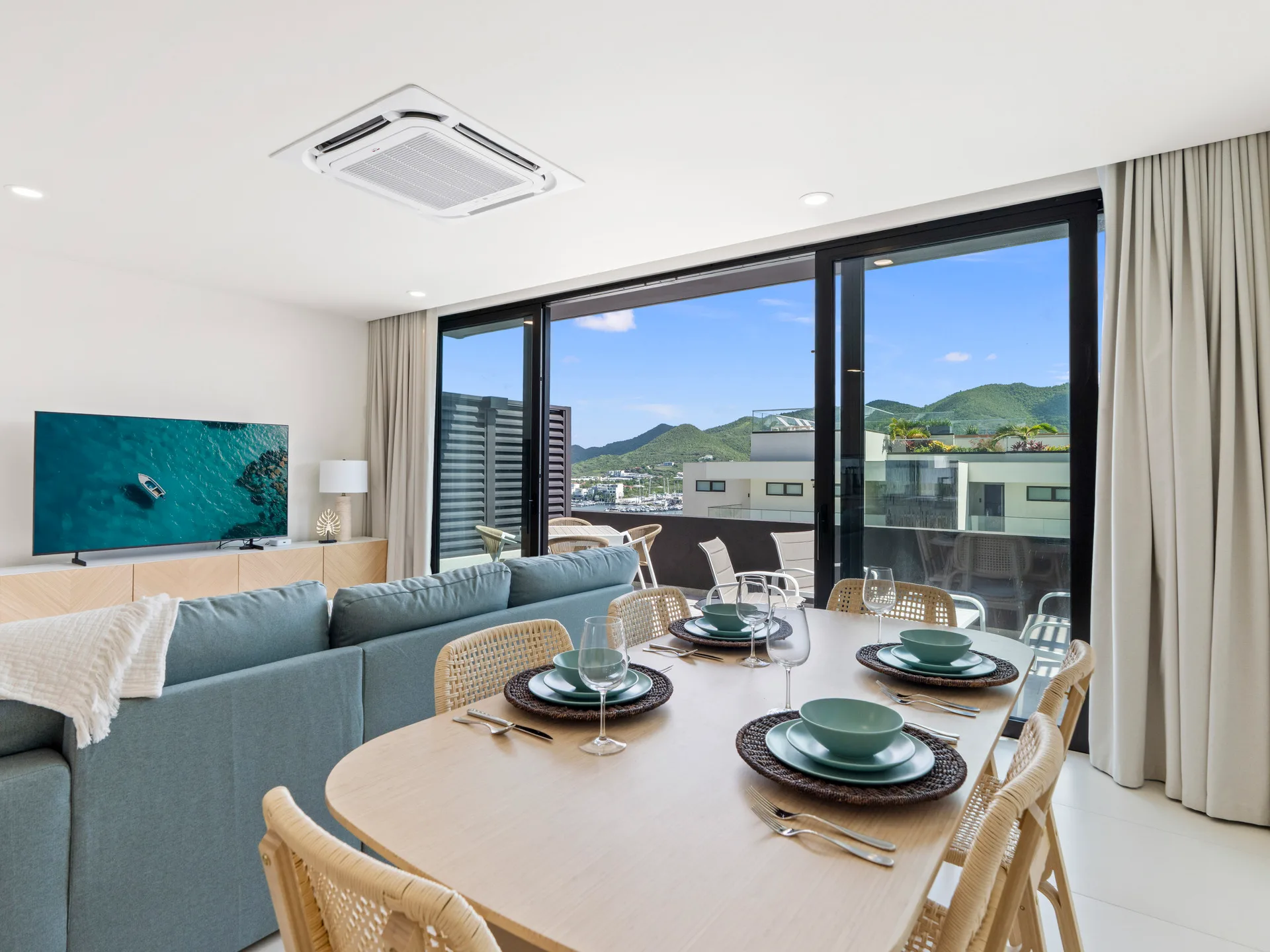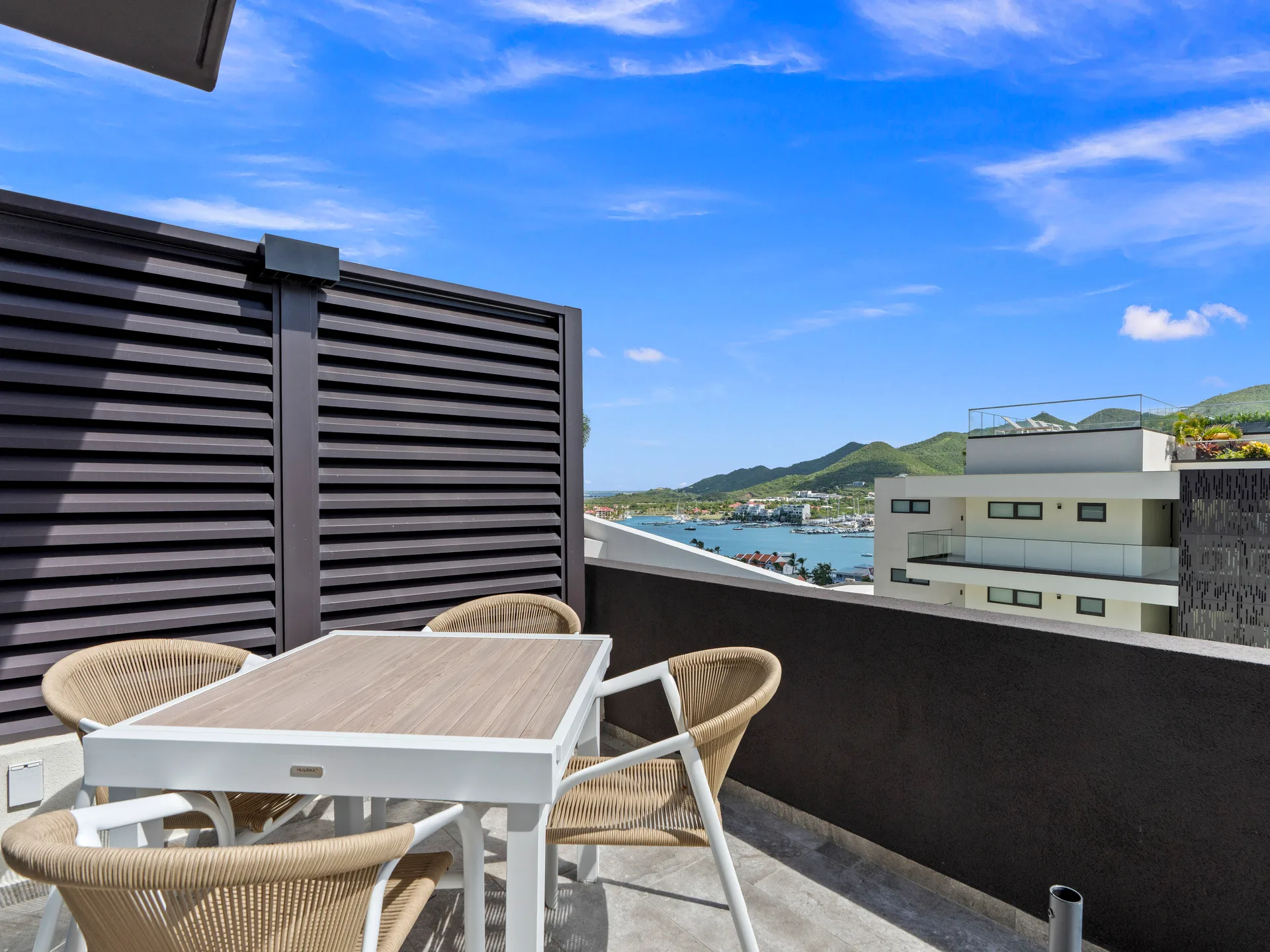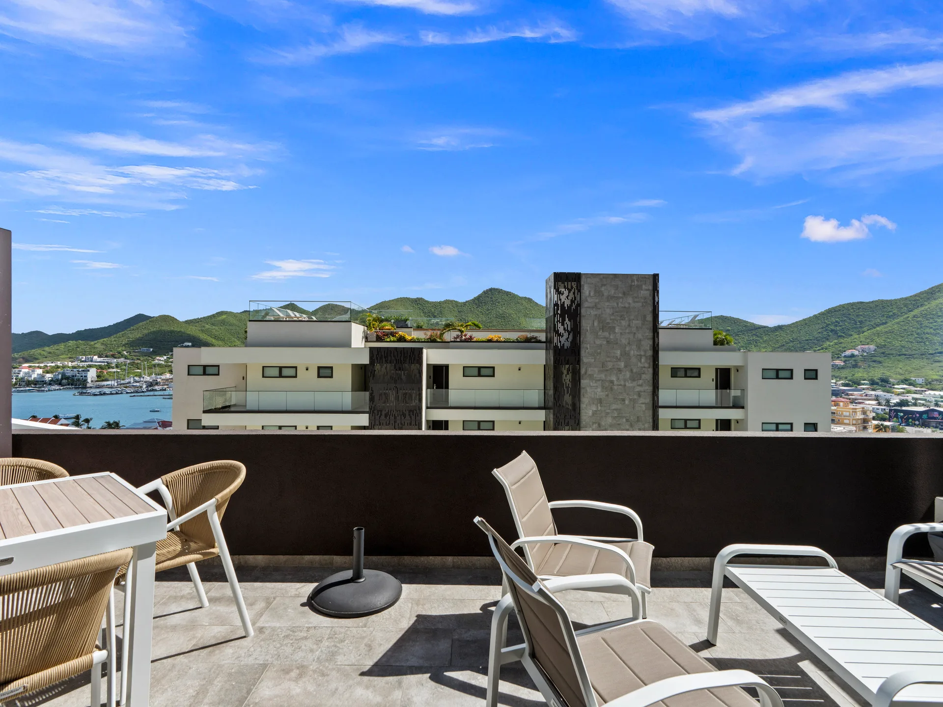 Step into this amazing two-bedroom, two-bathroom corner suite, perfectly designed to combine modern comfort with effortless elegance. Located on the ground floor of Building 3, this residence offers the convenience of easy access while still delivering stunning, panoramic views of the ocean, Anguilla, the lagoon, and the lush surrounding mountains.